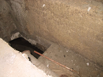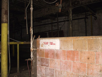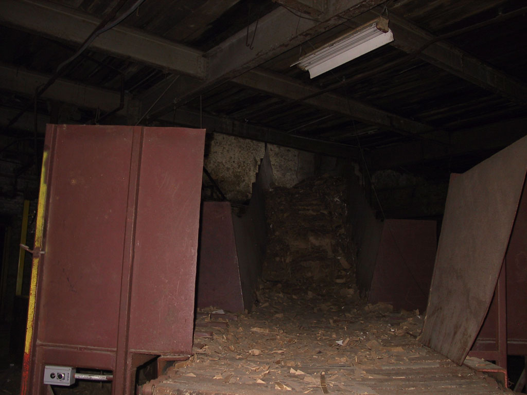 This pit in the floor might, I think, be located somewhere underneath the top of that conveyor apparatus. Or, it may not - I can't remember and the pictures are not too explicit about the subject. But if it is, then perhaps whatever machinery was once here had something to do with the odd conveyor.