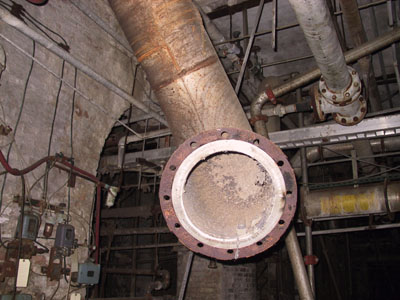 These pipes are labelled "Gelleco Tertiary Feed" and "Gelleco Secondary Reject". Doesn't that sound appealing? Actually, after writing this, it turns out that the word is Celleco, not Gelleco. And, as it also happens, Celleco is a line of centrifugal cleaners made by a company called Bancroft Western. Evidently these machines are used to remove contaminents from pulp or proto-pulp, to separate ink from pulp in deinked recycled paper (as was produced at this factory), and for some other separation and cleaning purposes. Given the secondary and tertiary labels, it seems that this mill employed quite a system of these cleaners to accomplish whatever they were doing with them.