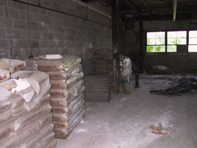 Here are some stacked up bags of chemicals in the chemical mixing room adjacent to the main (water treatment) room. Some of the bags contain caustic soda (sodium hydroxide), and others contain some other chemical, the identity of which currently eludes me. According to someone in the industry, caustic soda is used in pulp mills to help break down the wood fiber into paper pulp. To the best of my knowledge, however, this mill did not have an on-site pulp mill, although it did have a recycling facility, so I am not exactly sure precisely what the caustic soda was used for.